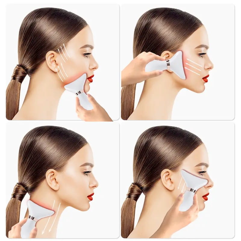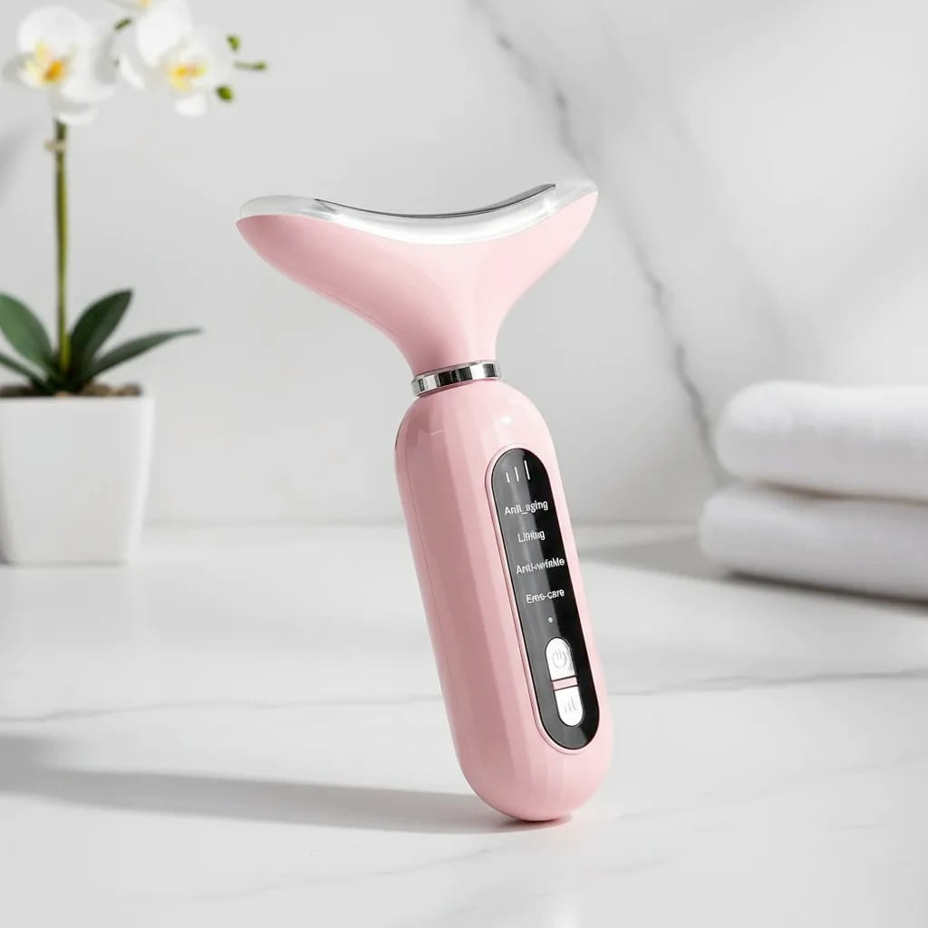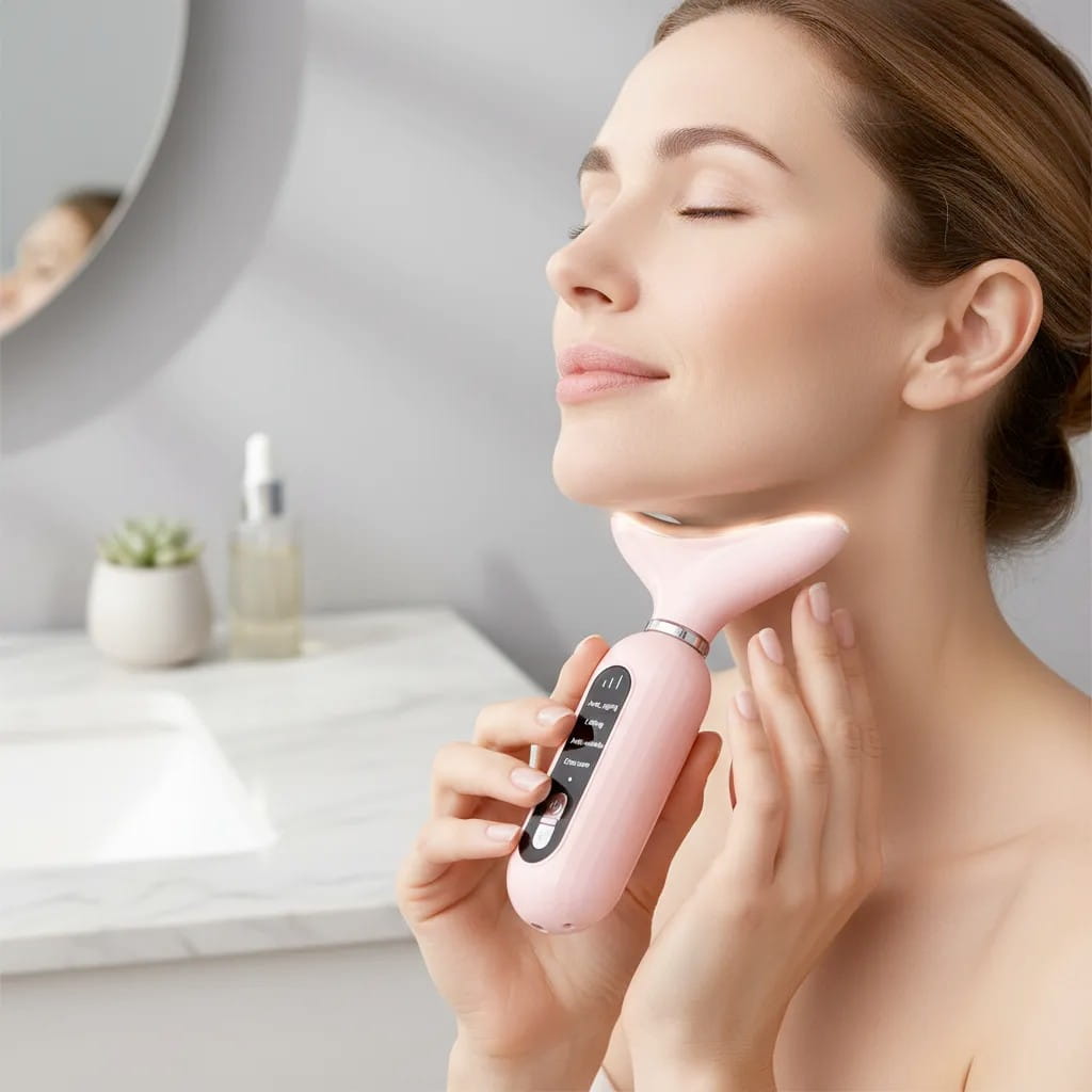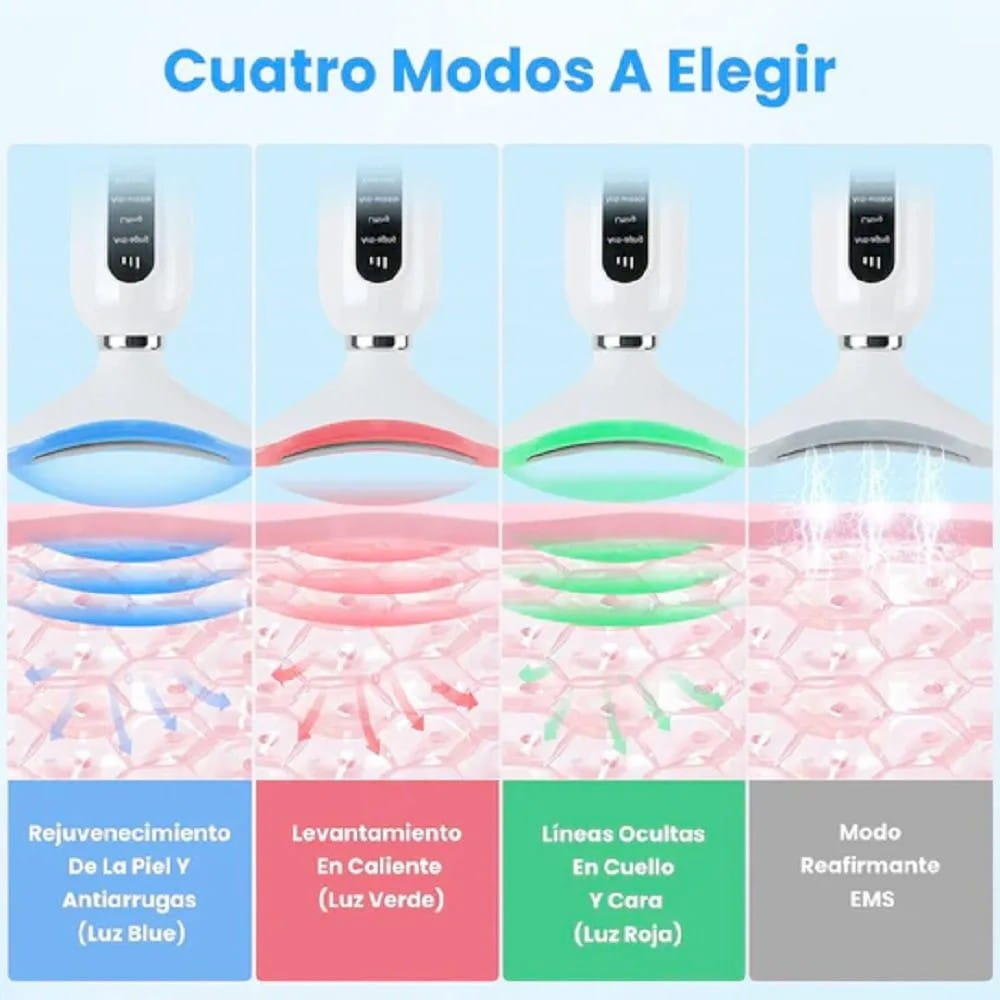 Dispositivo EMS de triple acción que activa el colágeno con calor y vibración para eliminar la flacidez del cuello y rostro, revelando una piel firme y esculpida desde el primer uso.