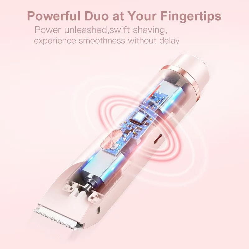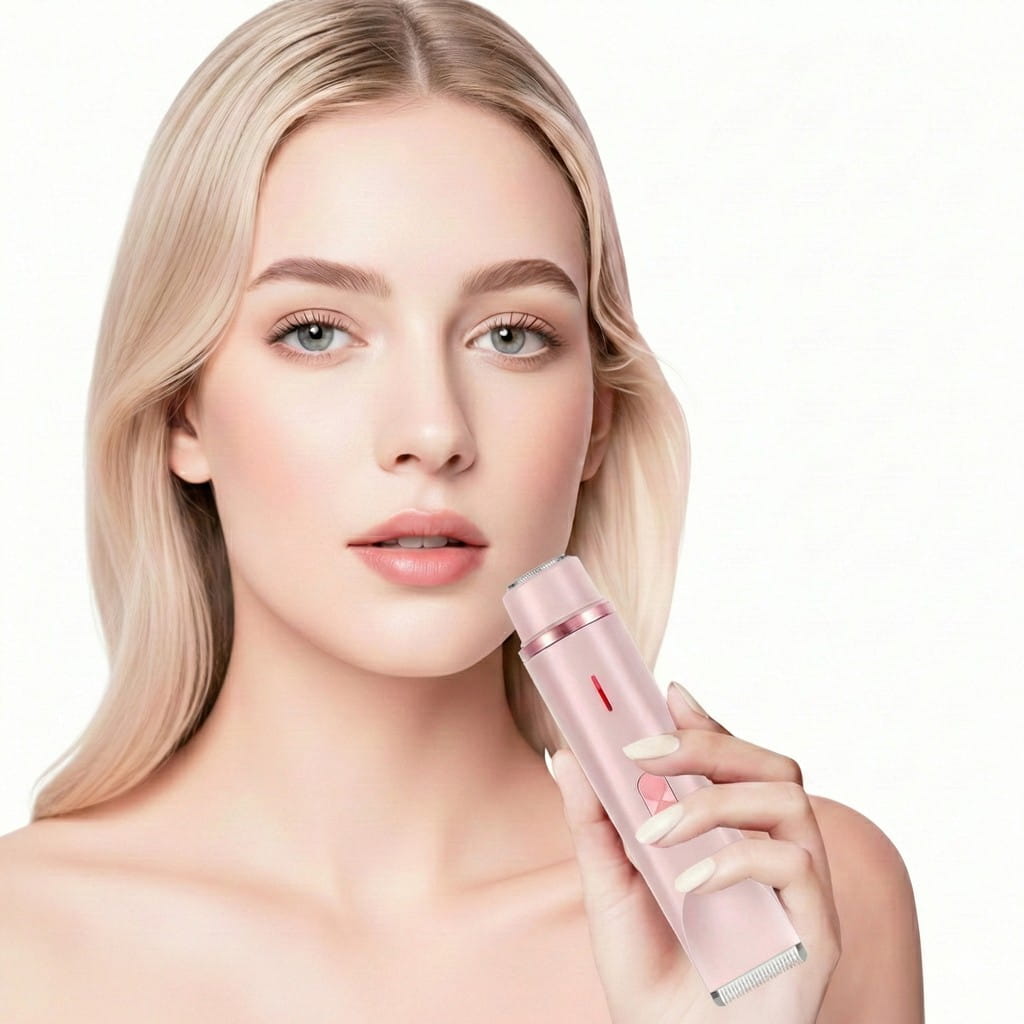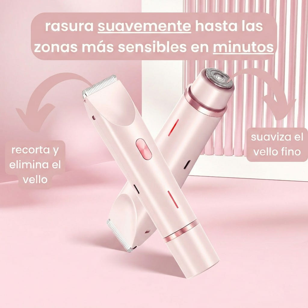 Sistema de depilación de doble cabezal que micro-recorta el vello sin contacto agresivo, garantizando una piel de seda libre de cortes, irritación y vellos encarnados al instante.